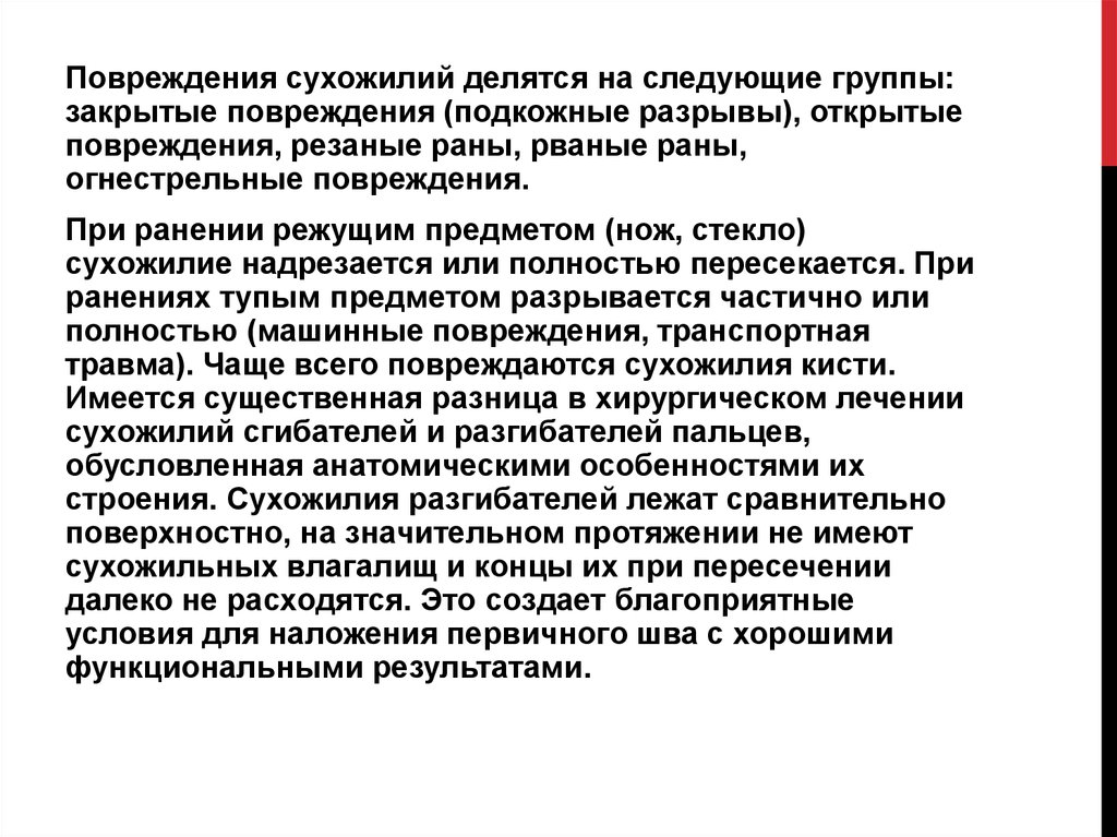 Повреждения сухожилий делятся на следующие группы:закрытые повреждения (подкожные разрывы), открытые