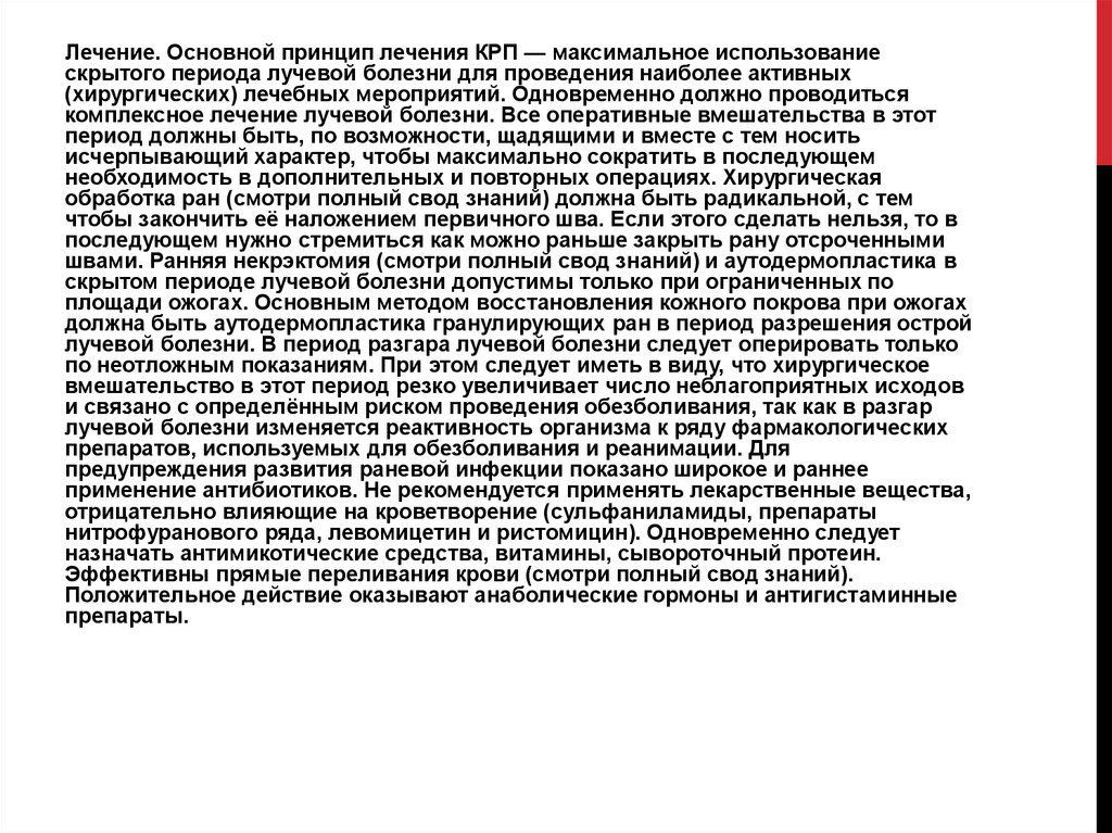 Лечение. Основной принцип лечения КРП — максимальное использованиескрытого периода лучевой болезни для проведения наиболее активных