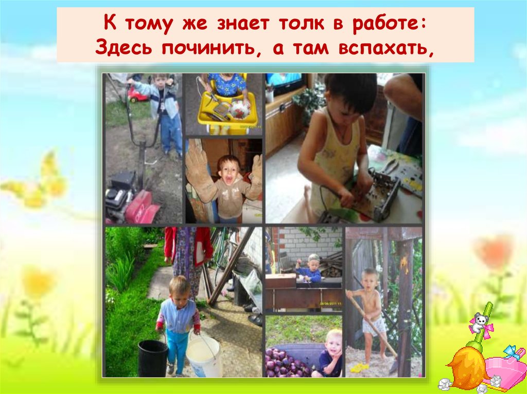К тому же знает толк в работе:Здесь починить, а там вспахать,