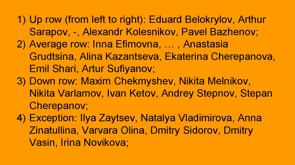 1) Up row (from left to right): Eduard Belokrylov, ArthurSarapov, -, Alexandr Kolesnikov, Pavel Bazhenov;