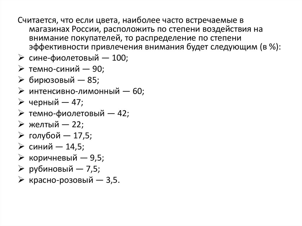 Считается, что если цвета, наиболее часто встречаемые вмагазинах России, расположить по степени воздействия на