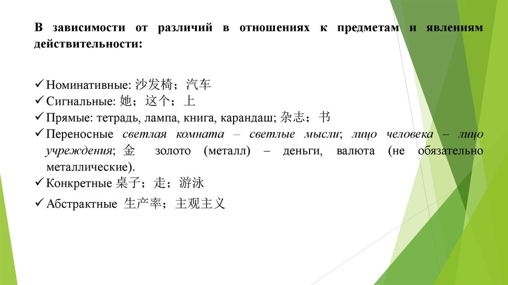 В зависимости от различий в отношениях к предметам и явлениямдействительности: