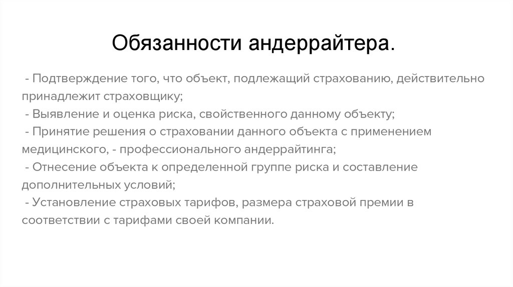Обязанности андеррайтера.- Подтверждение того, что объект, подлежащий страхованию, действительно