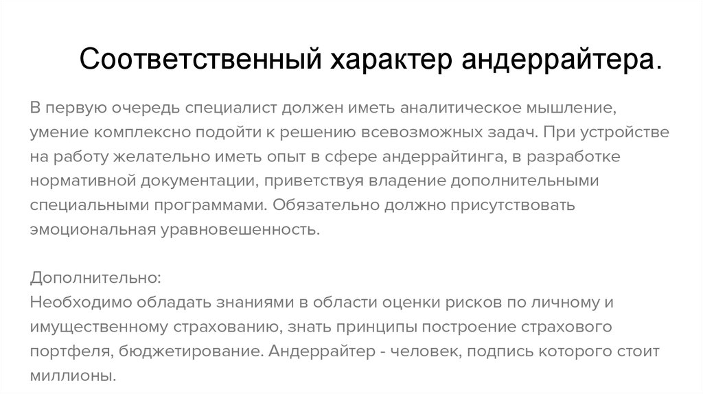Соответственный характер андеррайтера.В первую очередь специалист должен иметь аналитическое мышление,