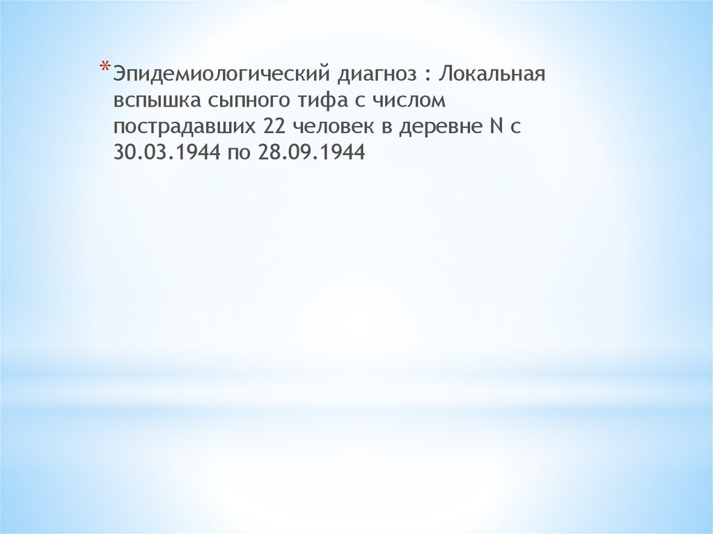 * Эпидемиологический диагноз : Локальнаявспышка сыпного тифа с числом