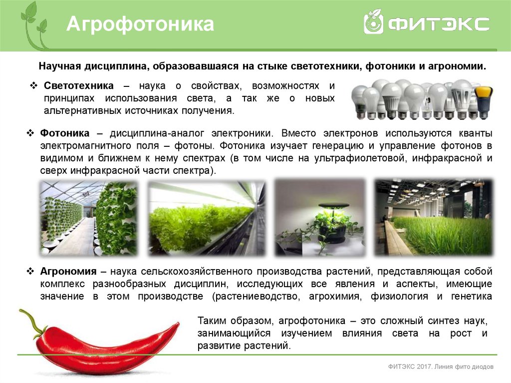 АгрофотоникаНаучная дисциплина, образовавшаяся на стыке светотехники, фотоники и агрономии.