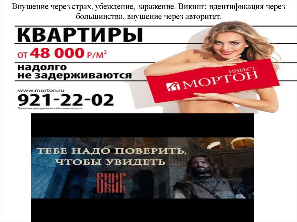 Внушение через страх, убеждение, заражение. Викинг: идентификация черезбольшинство, внушение через авторитет.