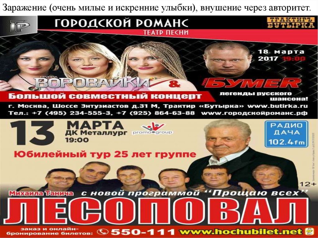 Заражение (очень милые и искренние улыбки), внушение через авторитет.22.