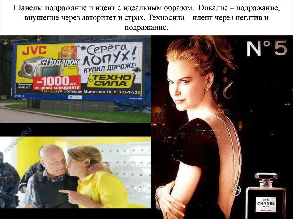 Шанель: подражание и идент с идеальным образом. Duкалис – подражание,внушение через авторитет и страх. Техносила – идент через негатив и