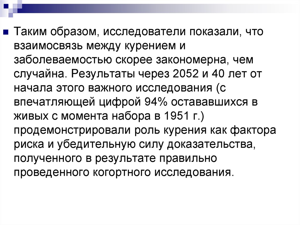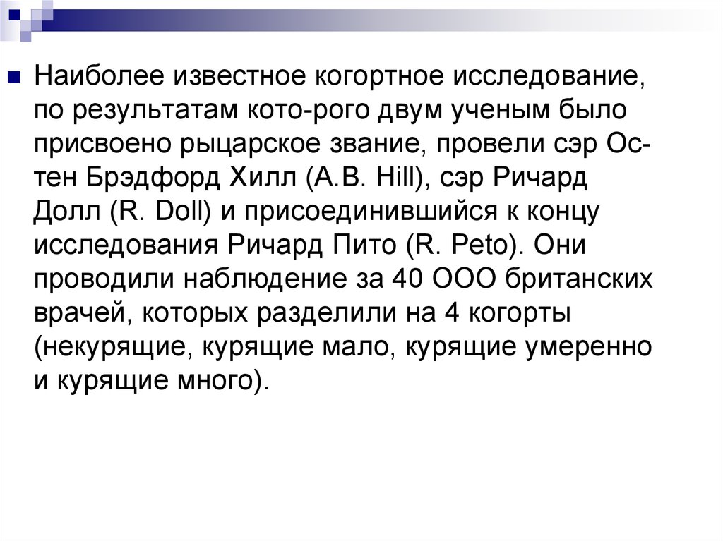 Наиболее известное когортное исследование,по результатам кото-рого двум ученым было
