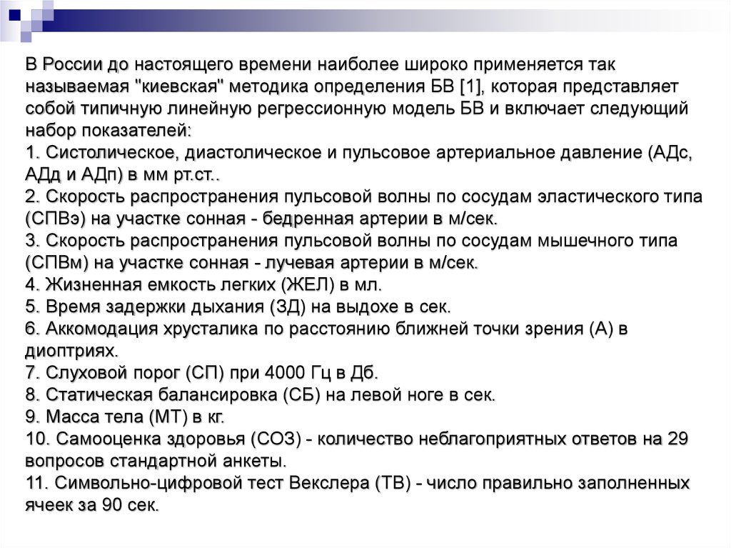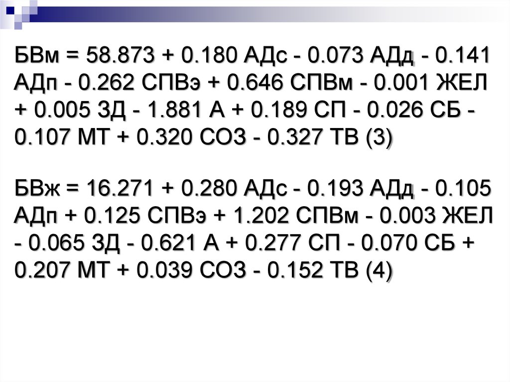 БВм = 58.873 + 0.180 АДс - 0.073 АДд - 0.141АДп - 0.262 СПВэ + 0.646 СПВм - 0.001 ЖЕЛ