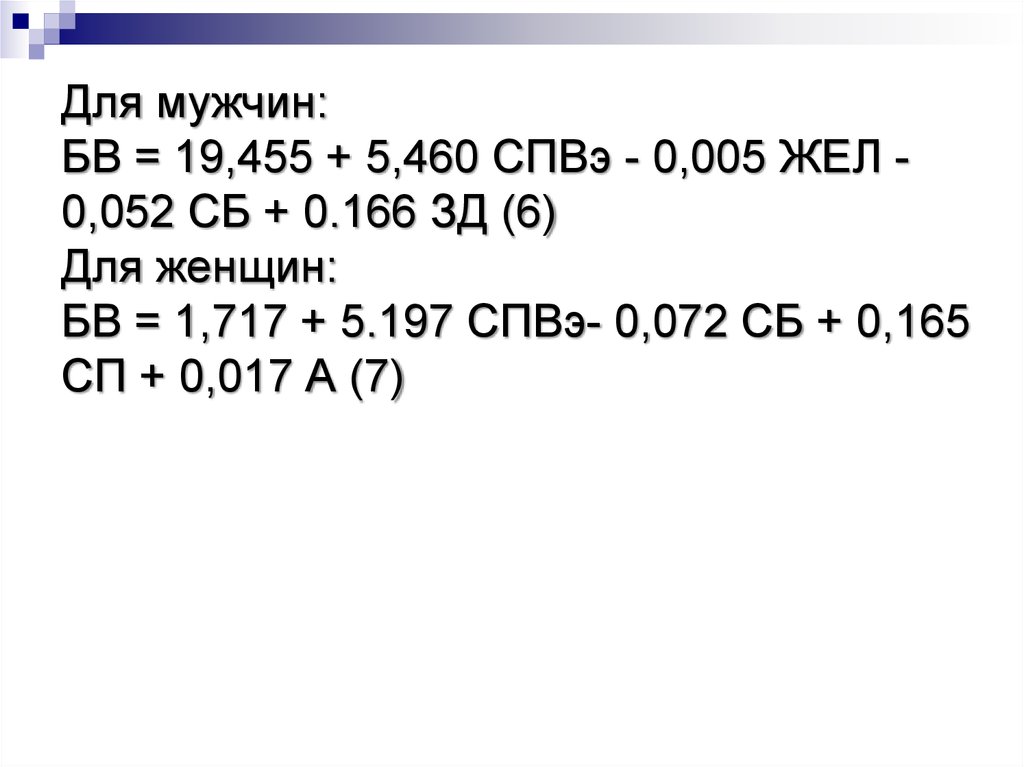 Для мужчин:БВ = 19,455 + 5,460 СПВэ - 0,005 ЖЕЛ 0,052 СБ + 0.166 ЗД (6)