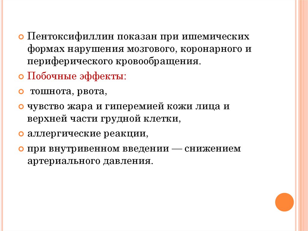 Пентоксифиллин показан при ишемическихформах нарушения мозгового, коронарного и