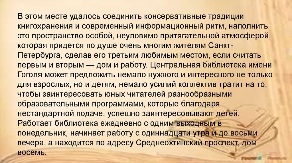 В этом месте удалось соединить консервативные традициикнигохранения и современный информационный ритм, наполнить