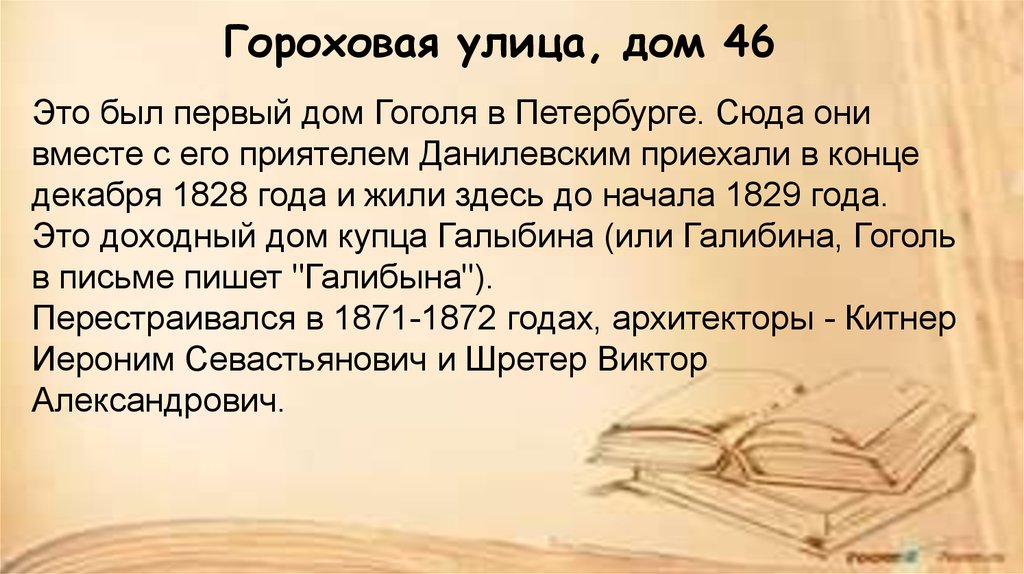 Гороховая улица, дом 46Это был первый дом Гоголя в Петербурге. Сюда они