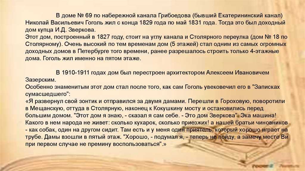 В доме № 69 по набережной канала Грибоедова (бывший Екатерининский канал)Николай Васильевич Гоголь жил с конца 1829 года по май 1831 года. Тогда это был доходный