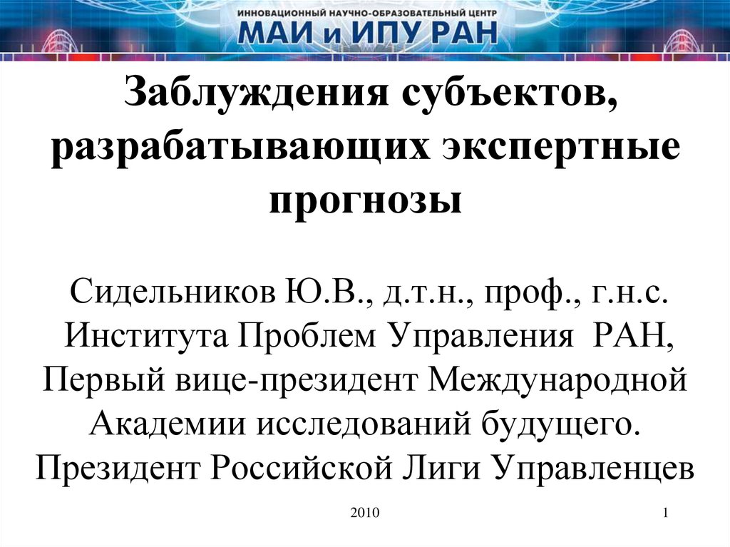 1. Заблуждения субъектов, разрабатывающих экспертные прогнозы Сидельников Ю.В., д.т.н., проф., г.н.с. Института Проблем Управления РАН, Первый ви