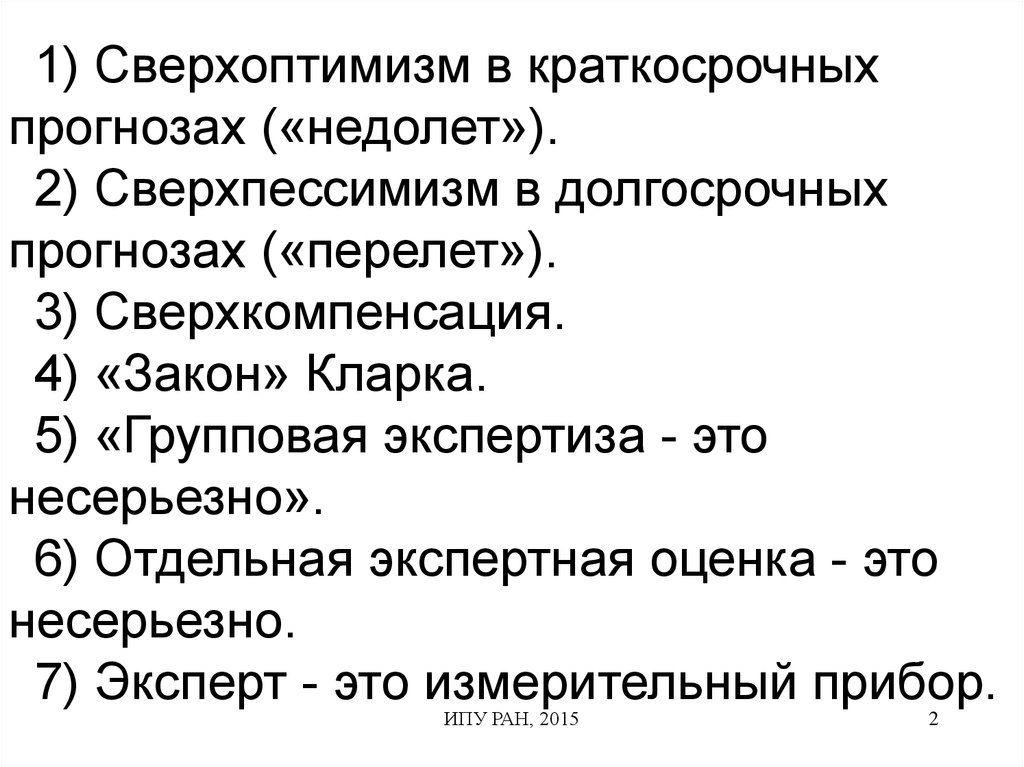 1) Сверхоптимизм в краткосрочныхпрогнозах («недолет»).