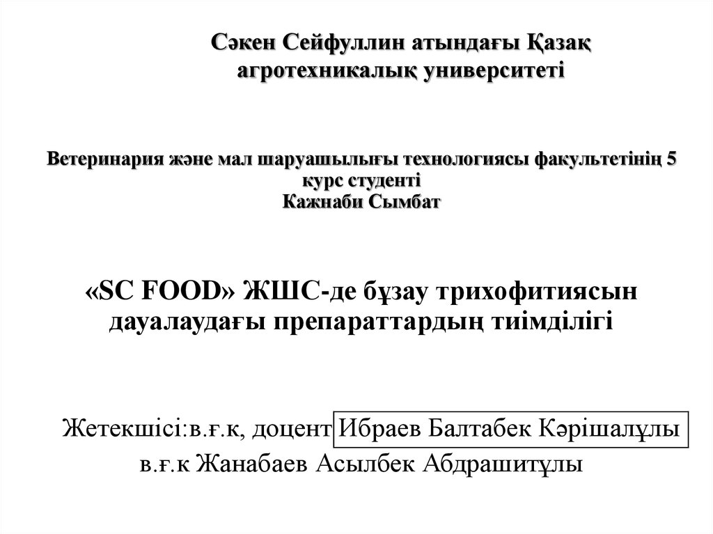 «SC FOOD» ЖШС-де бұзау трихофитиясын дауалаудағы препараттардың тиімділігі