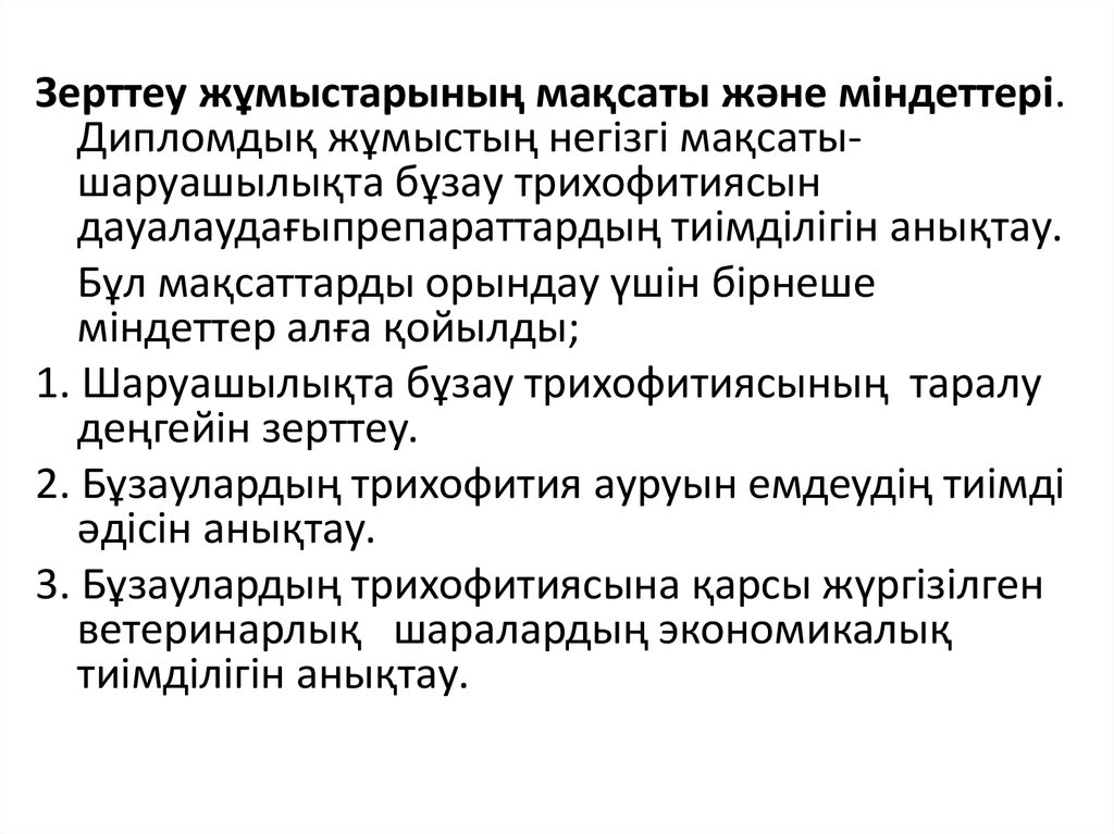 Зерттеу жұмыстарының мақсаты және міндеттері.Дипломдық жұмыcтың негізгі мақсатышаруашылықта бұзау трихофитиясын