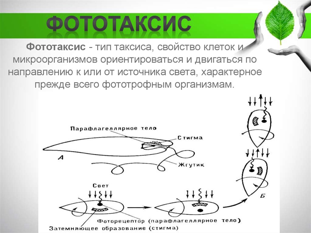 Фототаксис - тип таксиса, свойство клеток имикроорганизмов ориентироваться и двигаться по