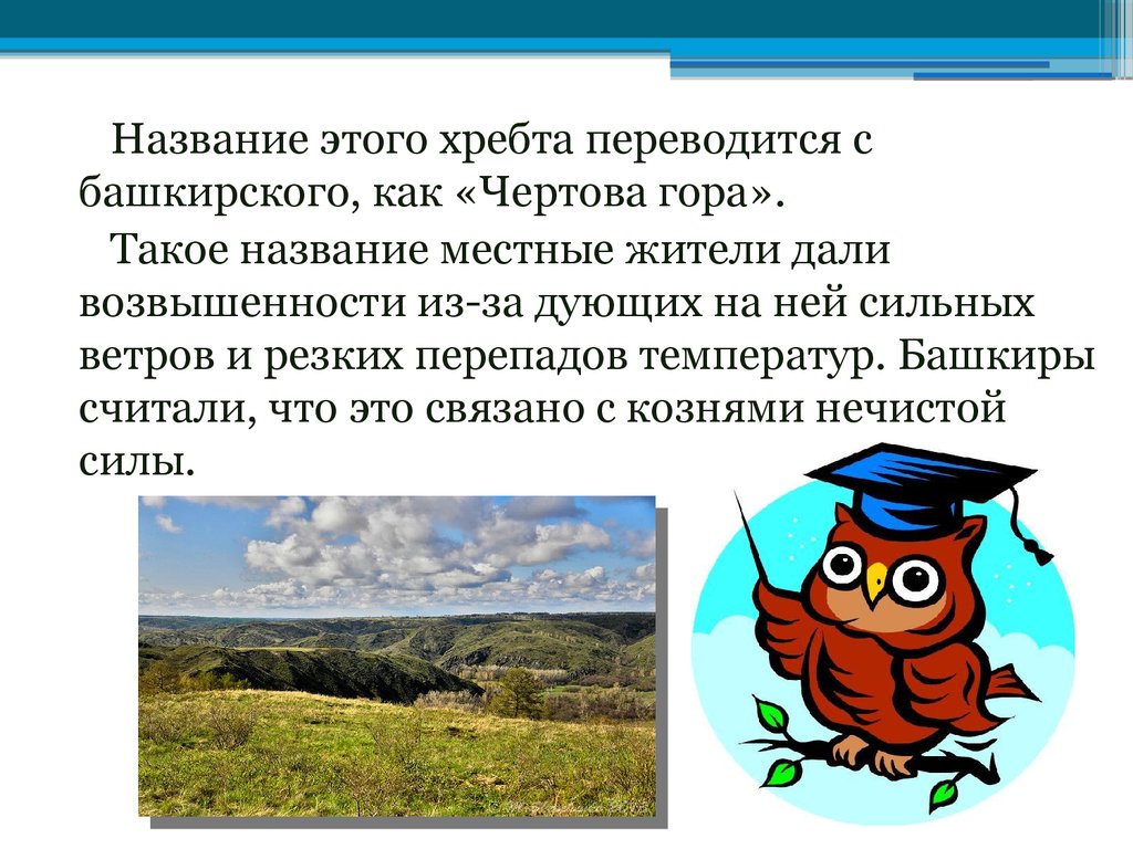 Название этого хребта переводится сбашкирского, как «Чертова гора».