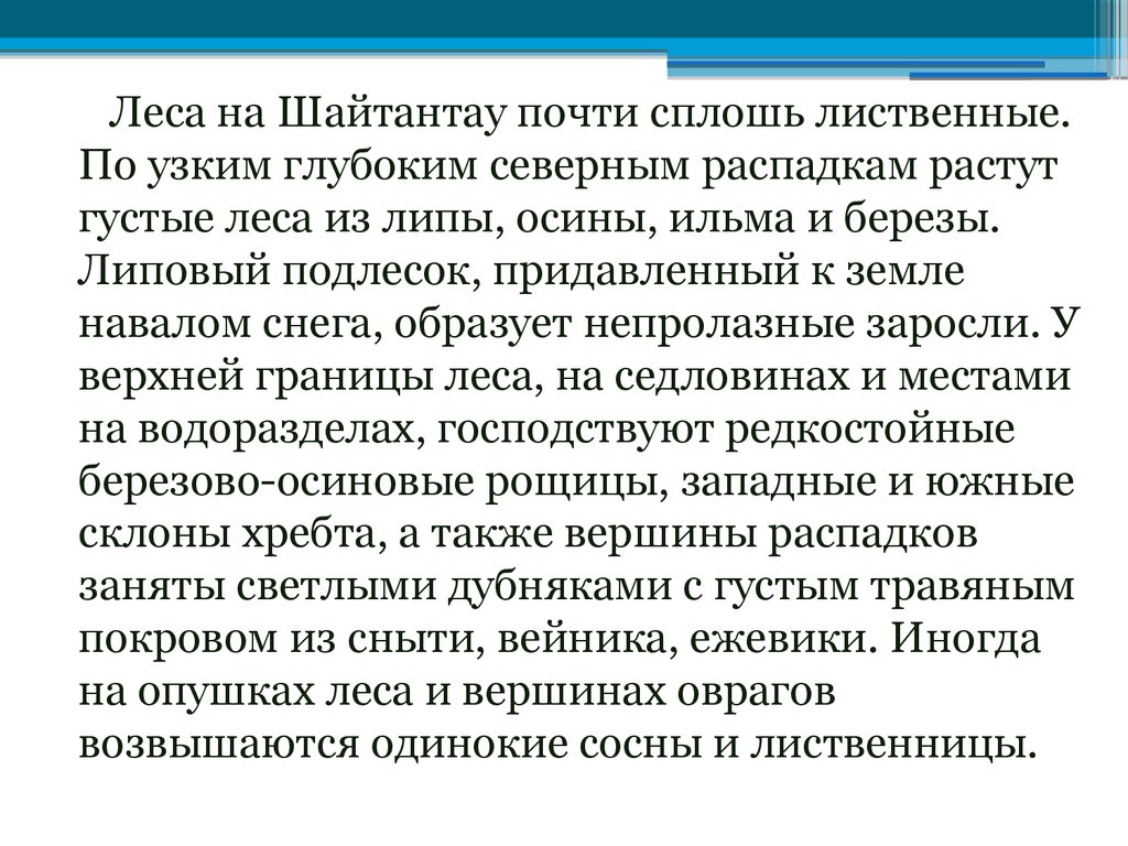 Леса на Шайтантау почти сплошь лиственные.По узким глубоким северным распадкам растут
