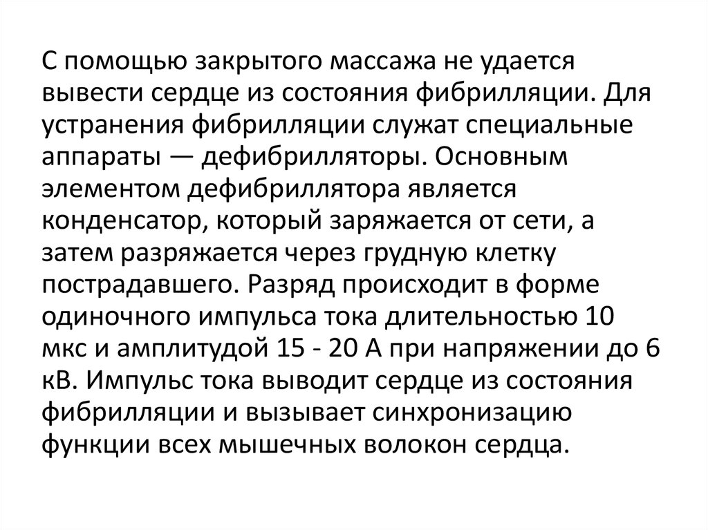 С помощью закрытого массажа не удаетсявывести сердце из состояния фибрилляции. Для