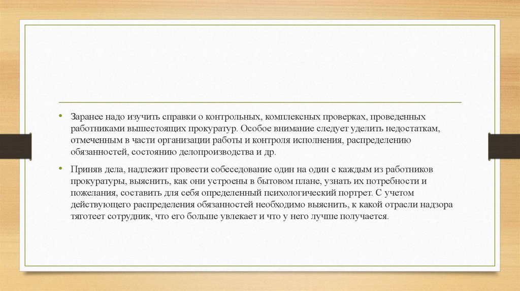 • Заранее надо изучить справки о контрольных, комплексных проверках, проведенныхработниками вышестоящих прокуратур. Особое внимание следует уделить недостаткам,