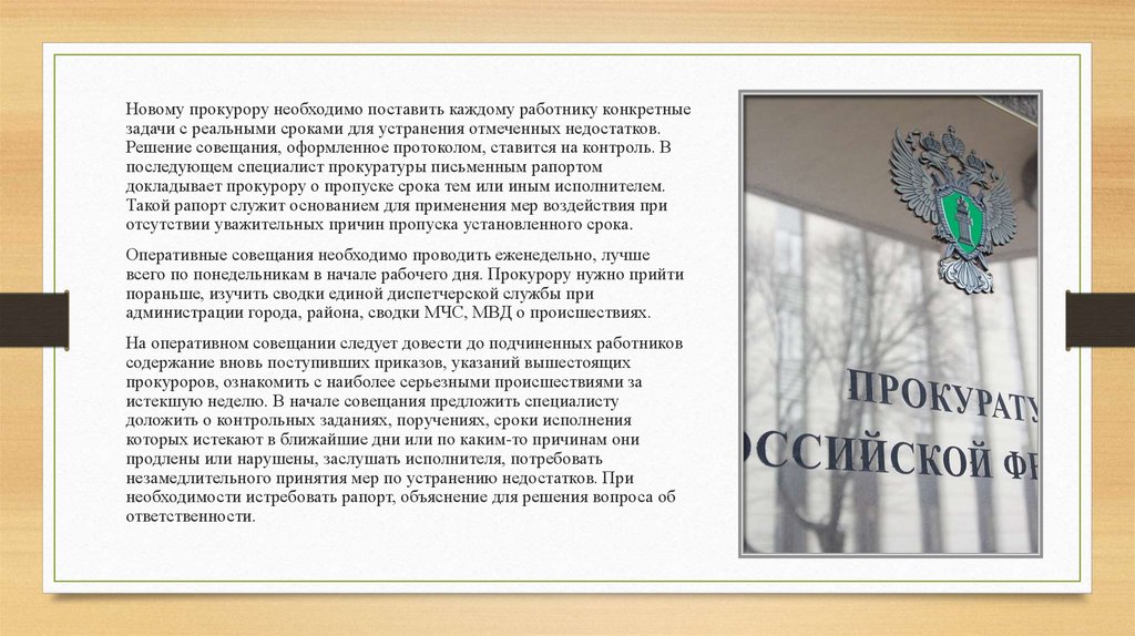 Новому прокурору необходимо поставить каждому работнику конкретныезадачи с реальными сроками для устранения отмеченных недостатков.