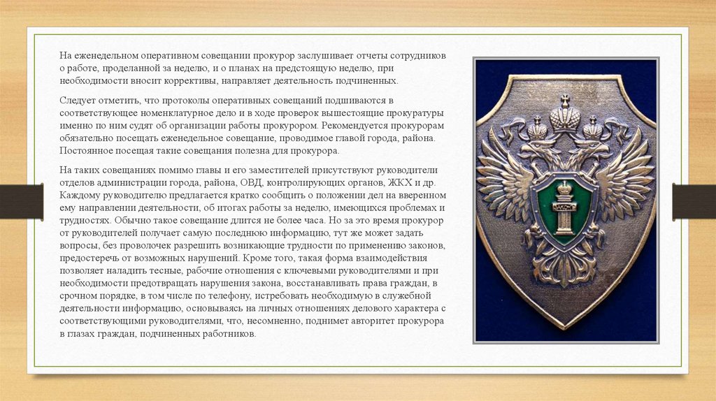 На еженедельном оперативном совещании прокурор заслушивает отчеты сотрудниково работе, проделанной за неделю, и о планах на предстоящую неделю, при