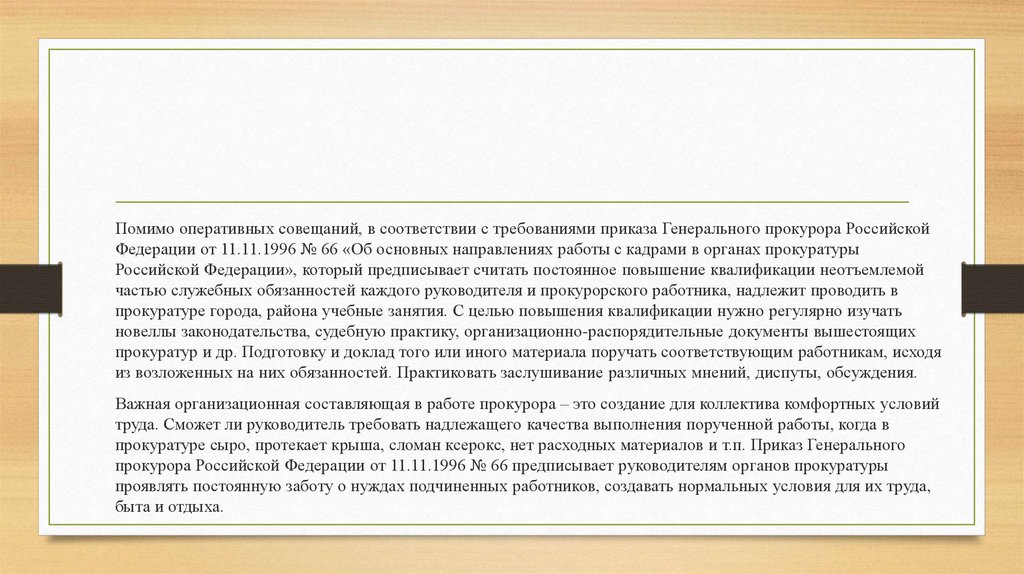 Помимо оперативных совещаний, в соответствии с требованиями приказа Генерального прокурора РоссийскойФедерации от 11.11.1996 № 66 «Об основных направлениях работы с кадрами в органах прокуратуры