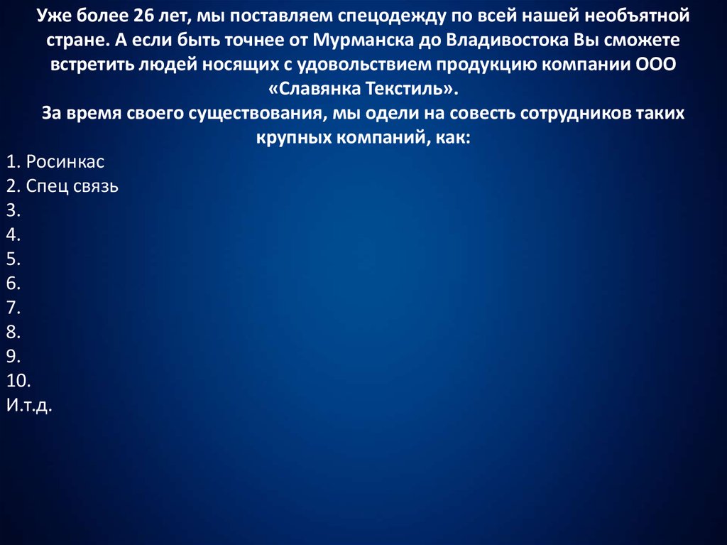 Уже более 26 лет, мы поставляем спецодежду по всей нашей необъятнойстране. А если быть точнее от Мурманска до Владивостока Вы сможете