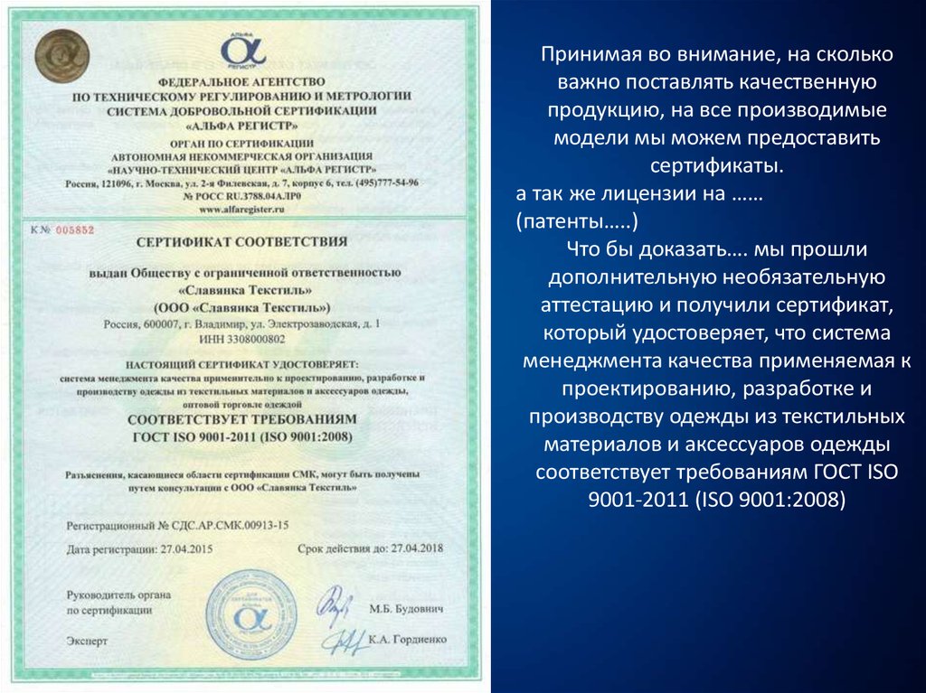 В том числе ООО «СлавянкаТекстиль» имеем разрешение