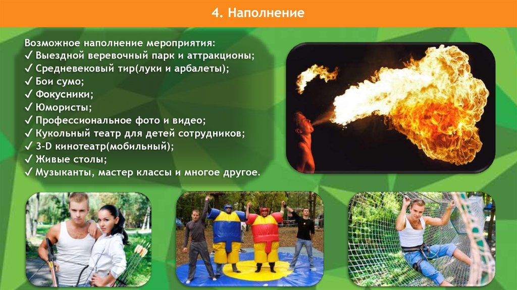 Возможное наполнение мероприятия:✔ Выездной веревочный парк и аттракционы;