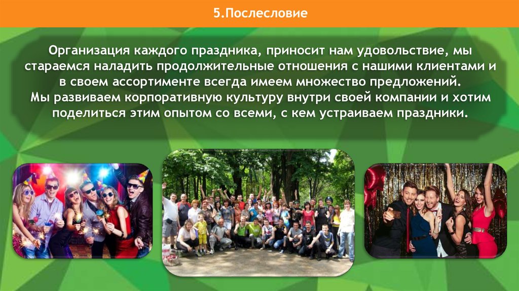 Организация каждого праздника, приносит нам удовольствие, мыстараемся наладить продолжительные отношения с нашими клиентами и