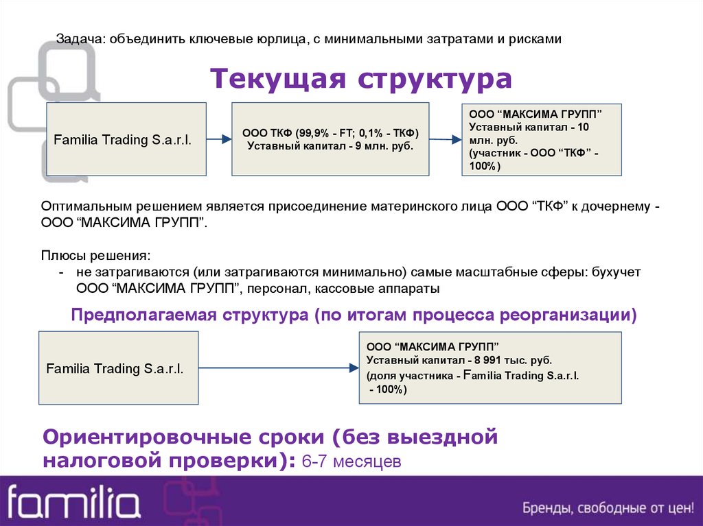 Оптимальным решением является присоединение материнского лица ООО “ТКФ” к дочернему ООО “МАКСИМА ГРУПП”.