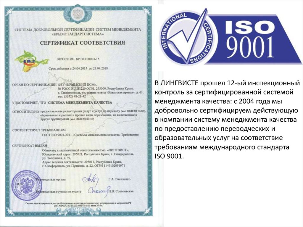 В ЛИНГВИСТЕ прошел 12-ый инспекционныйконтроль за сертифицированной системой
