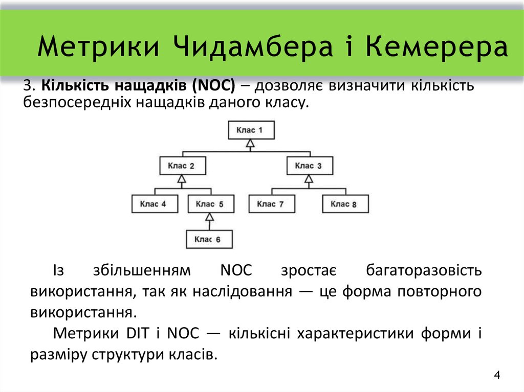 Метрики Чидамбера і Кемерера3. Кількість нащадків (NOC) – дозволяє визначити кількість