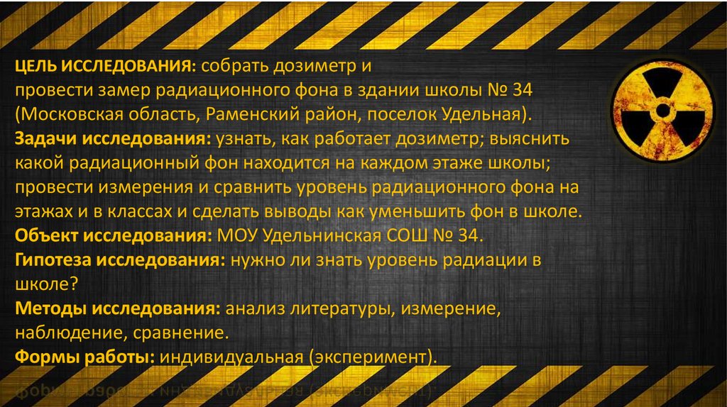 ЦЕЛЬ ИССЛЕДОВАНИЯ: собрать дозиметр ипровести замер радиационного фона в здании школы № 34