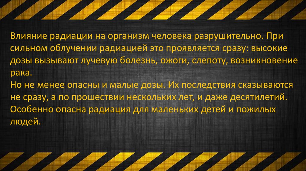 Влияние радиации на организм человека разрушительно. Присильном облучении радиацией это проявляется сразу: высокие