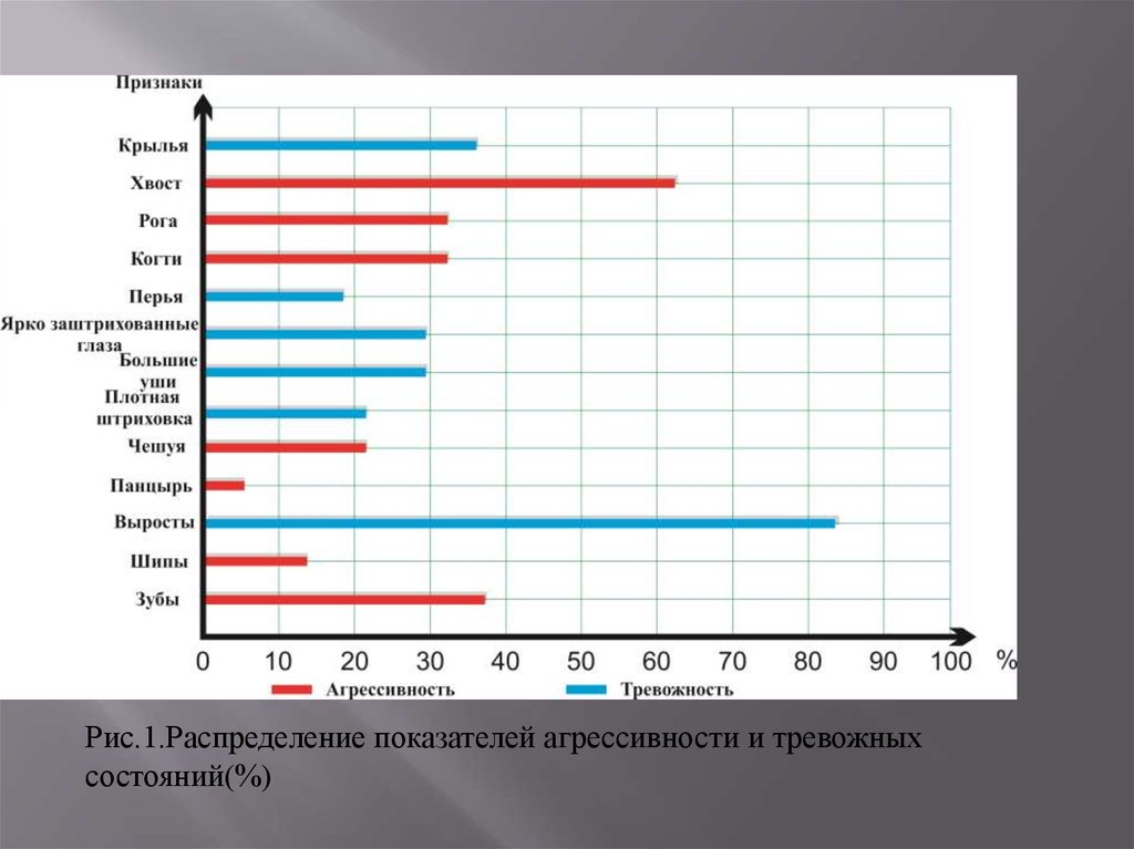 Рис.1.Распределение показателей агрессивности и тревожныхсостояний(%)