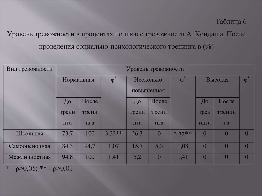 Таблица 6Уровень тревожности в процентах по шкале тревожности А. Кондаша. После