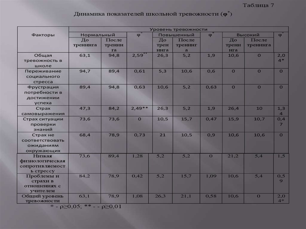 Таблица 7Динамика показателей школьной тревожности (φ*)