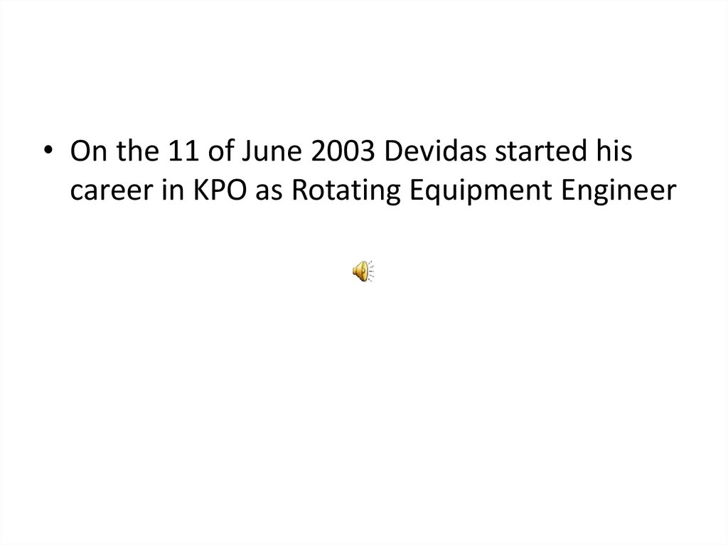 • On the 11 of June 2003 Devidas started hiscareer in KPO as Rotating Equipment Engineer