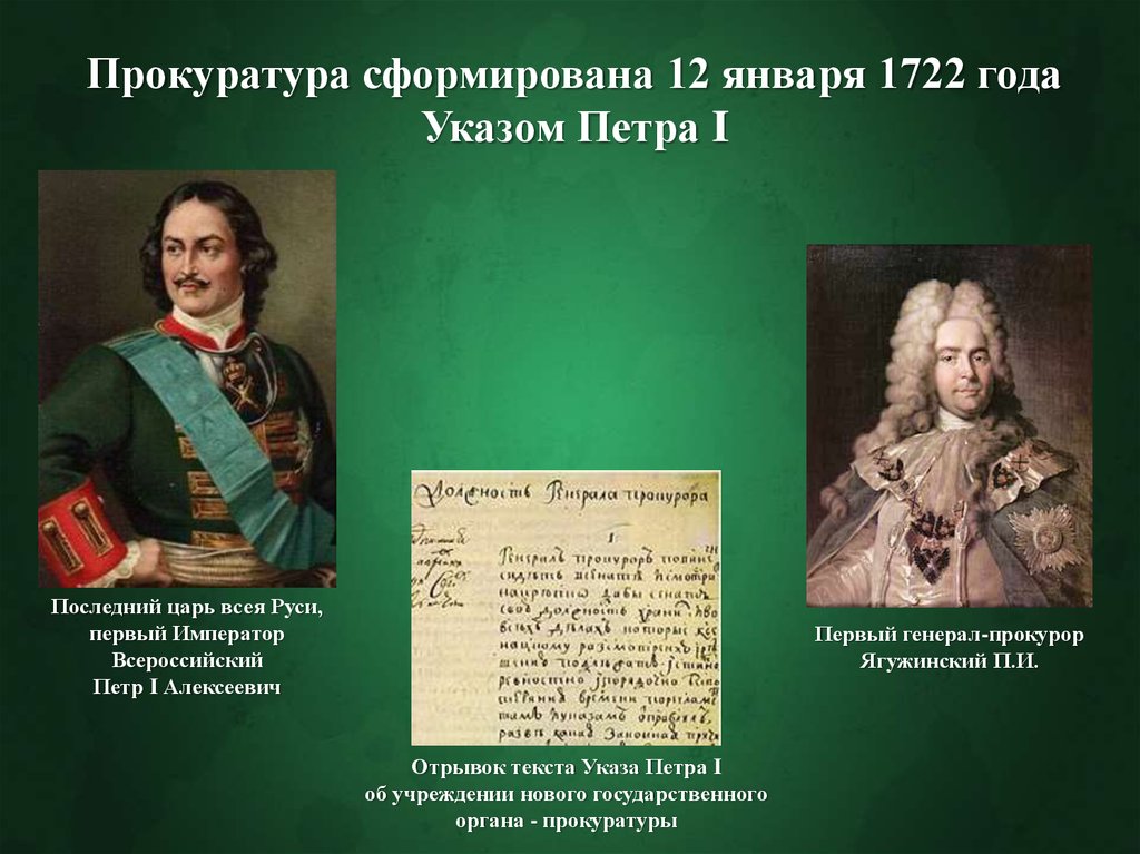Прокуратура сформирована 12 января 1722 годаУказом Петра I