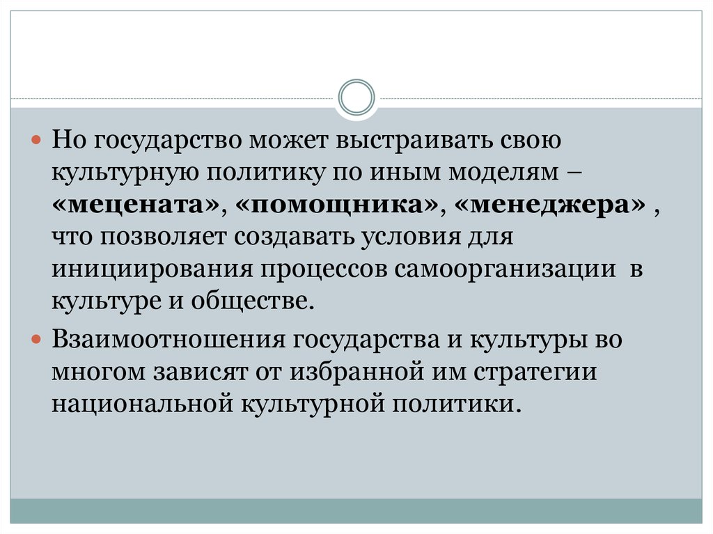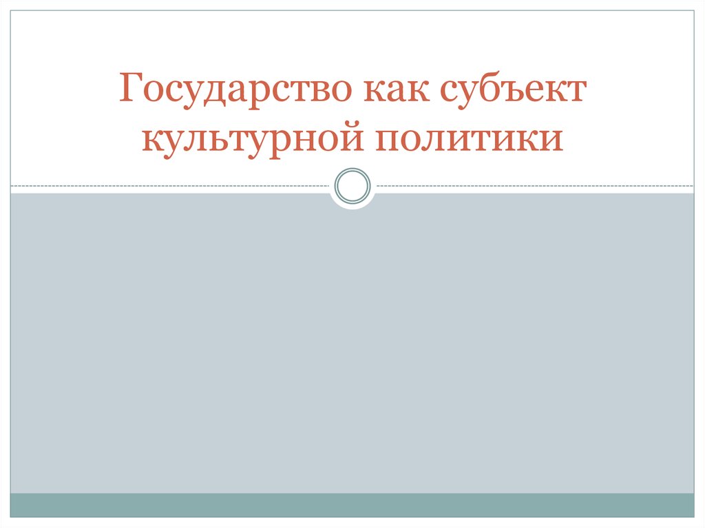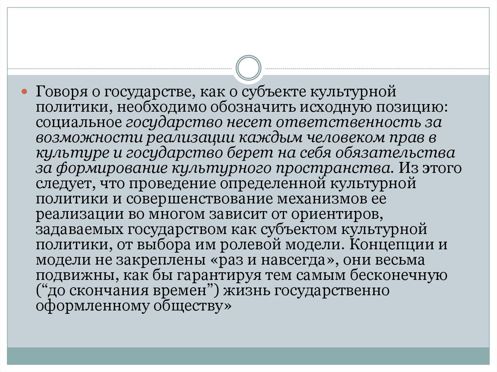 Говоря о государстве, как о субъекте культурнойполитики, необходимо обозначить исходную позицию:
