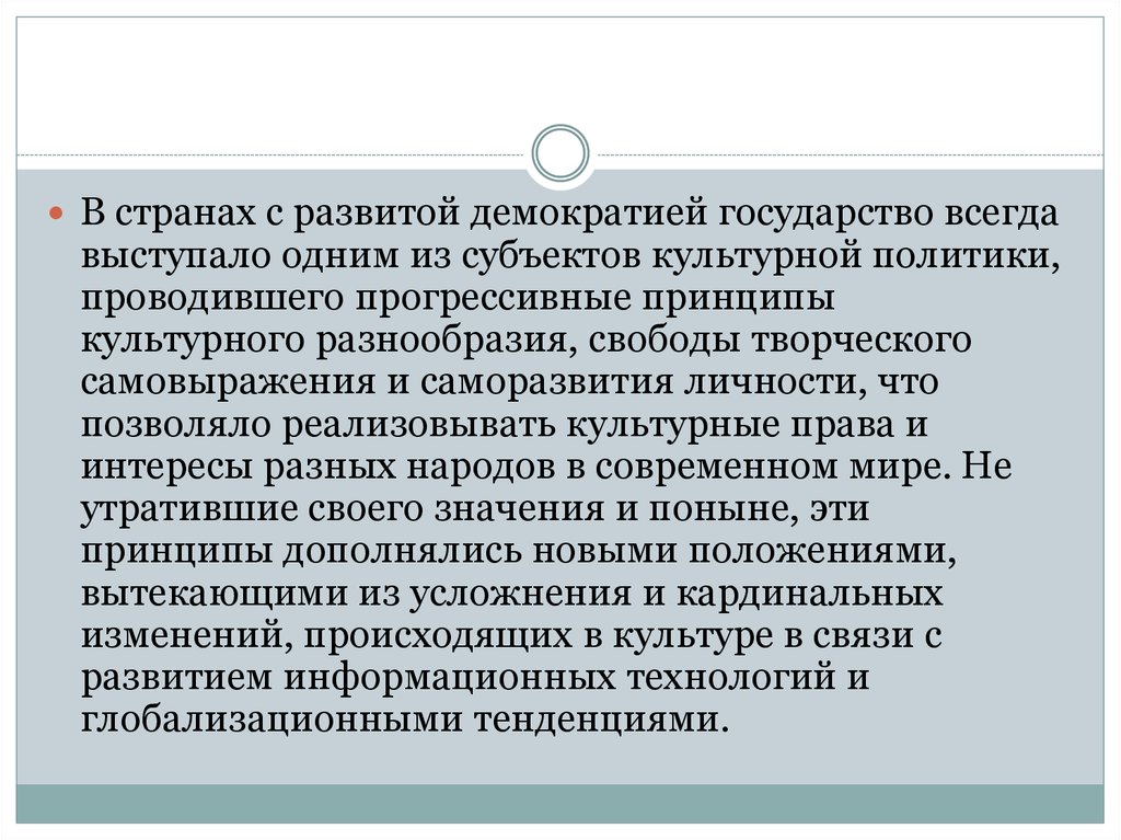 В странах с развитой демократией государство всегдавыступало одним из субъектов культурной политики,