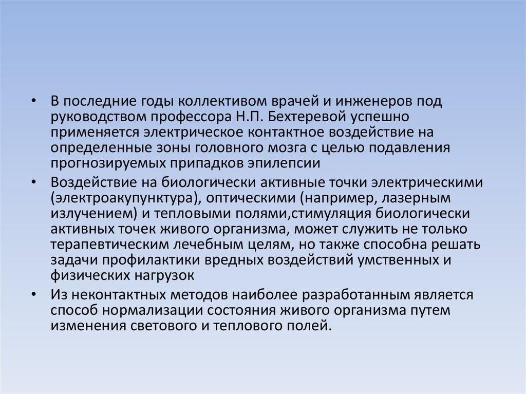 • В последние годы коллективом врачей и инженеров подруководством профессора Н.П. Бехтеревой успешно
