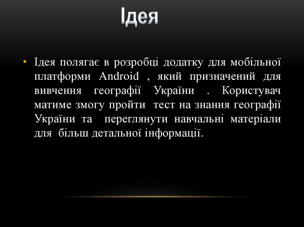 • Ідея полягає в розробці додатку для мобільноїплатформи Android , який призначений для